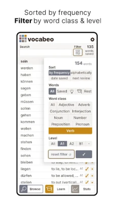 Enhance your German language skills swiftly and effectively with Vocabeo! This innovative app merges an extensive dictionary featuring the most commonly used German words with a robust vocabulary trainer that employs the technique of spaced repetition.