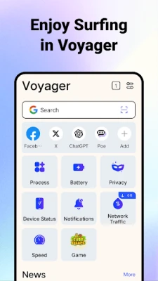 The home screen of Voyager features convenient function shortcuts, providing one-tap access to the tools you need most. This intuitive interface is designed to enhance user experience, making it easy for anyone to navigate the browser without a steep learning curve. Whether you’re a tech-savvy user or a beginner, Voyager’s layout is accessible and user-friendly.