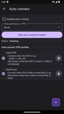 * Auto connect/pause/disconnect on WiFi/Mobile/WiMAX