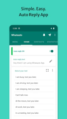 Our app is designed to support group messaging, allowing you to send auto-replies to any group within your preferred messaging application. Whether you're part of a work team, a family chat, or a social group, Whatauto ensures that your messages are delivered efficiently, keeping everyone informed without the need for constant monitoring.