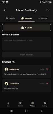Before making a purchase, it’s essential to know the value of the items. The app features community reviews and ratings for each item, providing insights from fellow players. This feedback helps you gauge the worth of an item, ensuring you invest your platinum in items that truly enhance your gameplay. With a community-driven approach, you can trust the opinions of other Tenno who have firsthand experience with the items.