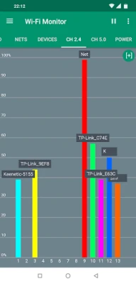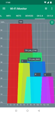 The app features charts that display available networks grouped by channels, specifically for 2.4 GHz and 5.0 GHz frequencies. Users can switch to a mode that shows channel width, utilizing the center frequency for each channel. Additionally, you have the option to pause updates, scale the view with finger gestures, or maximize the display with a double tap.