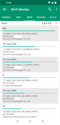 When it comes to available Wi-Fi networks, users can easily filter results to find the most suitable connection. The app provides a comprehensive list of networks, allowing you to open detailed information about each one. For devices running Android 11 and above, additional information such as router model, vendor, channels, country, streams, and extensions in the PRO version are accessible.