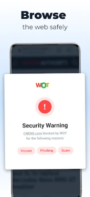 WOT is an application that helps protect you from identity theft and other online threats. It does this by sending you alerts if your passwords have been compromised by hackers, scanning your device for viruses, and securing your device against malicious apps. It also allows you to lock apps and protect your device from phishing scams and suspicious links. With over 1 million downloads, WOT is a trusted source for increasing your internet security, app security, and overall phone security.