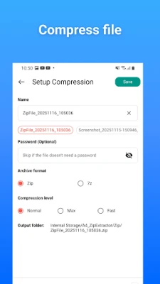 Compressing files has never been easier. With Zip RAR Extractor, you can quickly compress multiple files or entire folders into popular formats like ZIP or 7Z. This functionality not only saves storage space but also makes it easier to share large files via email or cloud services.